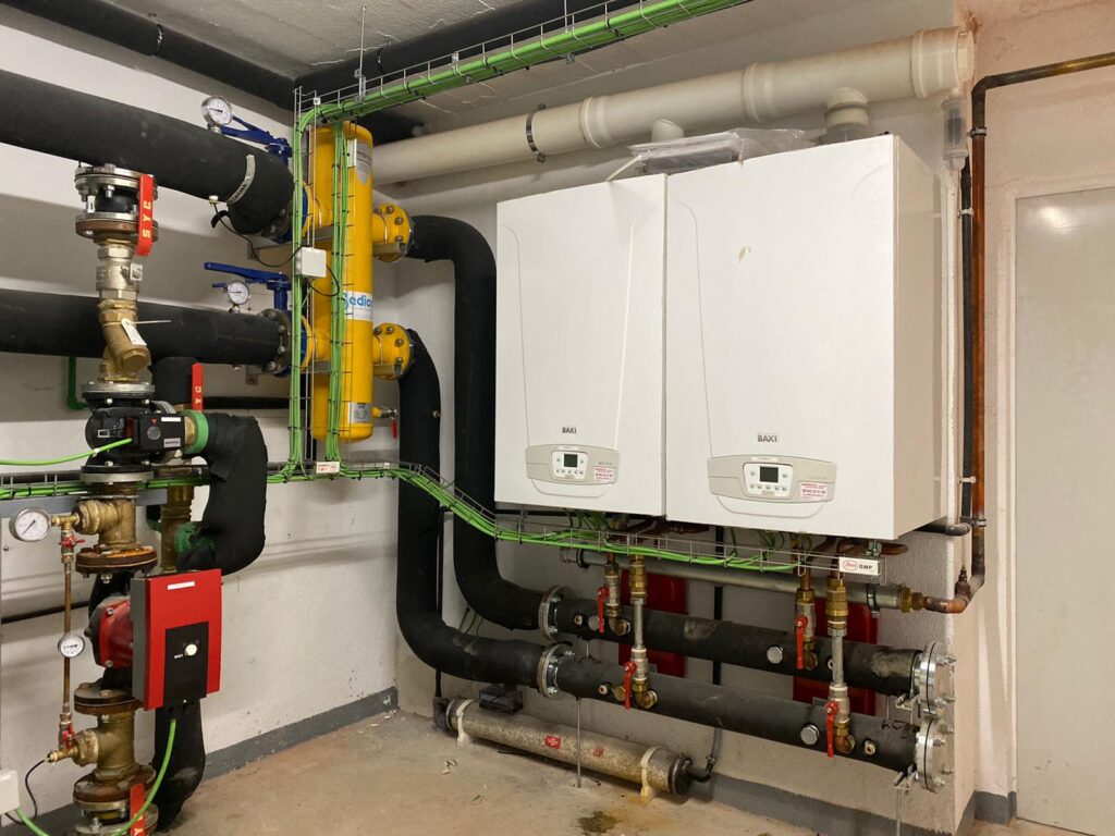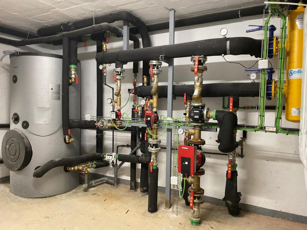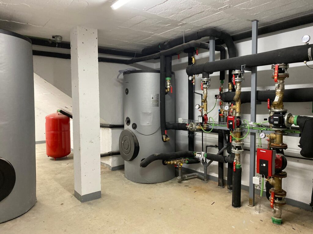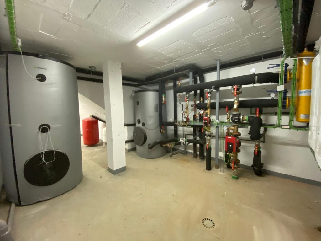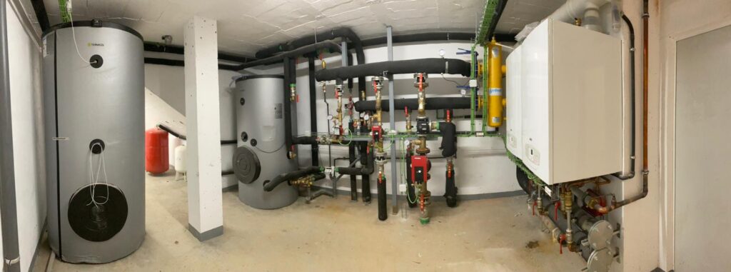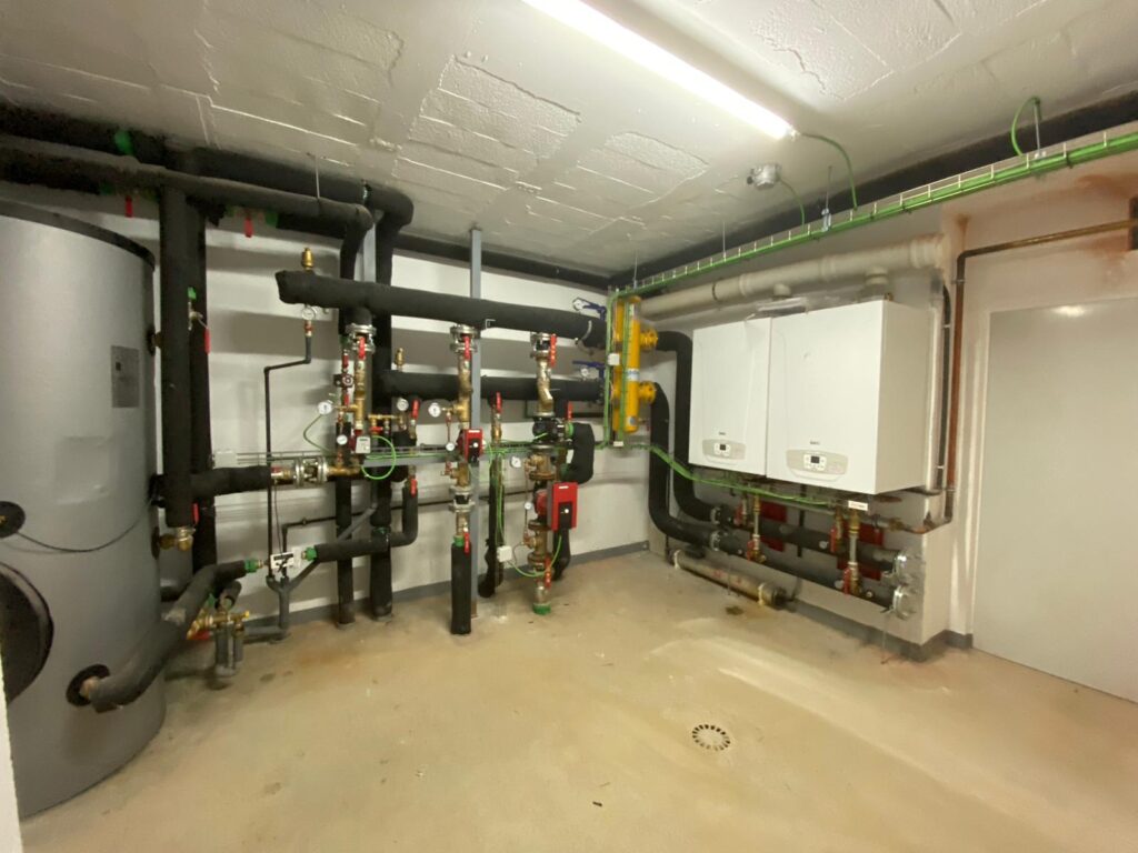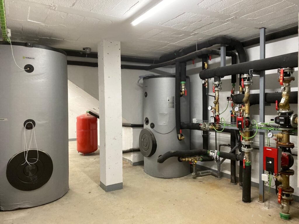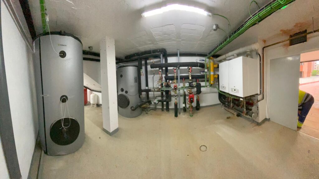 Instalación de fontanería, agua caliente sanitaria, aerotermia, calefacción por radiadores, suelo radiante y gas para 30 viviendas en Santander.