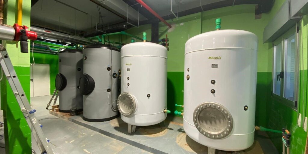 Seguimos avanzando en la Residencia Santa Lucía…. teniendo en disposición de servicio los Interacumuladores de precalentamiento y montando los dos acumuladores de consumo, 7000 litros de agua caliente sanitaria.